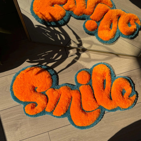 Brighten any room with the handmade Smile tufted Rug. a hand-tufted, 3D fluffy quote carpet in bold raised lettering. Crafted from soft yarns on an acrylic/cotton base, this compact rug works as a cozy bedside mat, a cheerful wall hanging, or an accent for studios and entryways. Each piece is carefully tufted by hand, so the texture and color have a unique, artisanal feel.